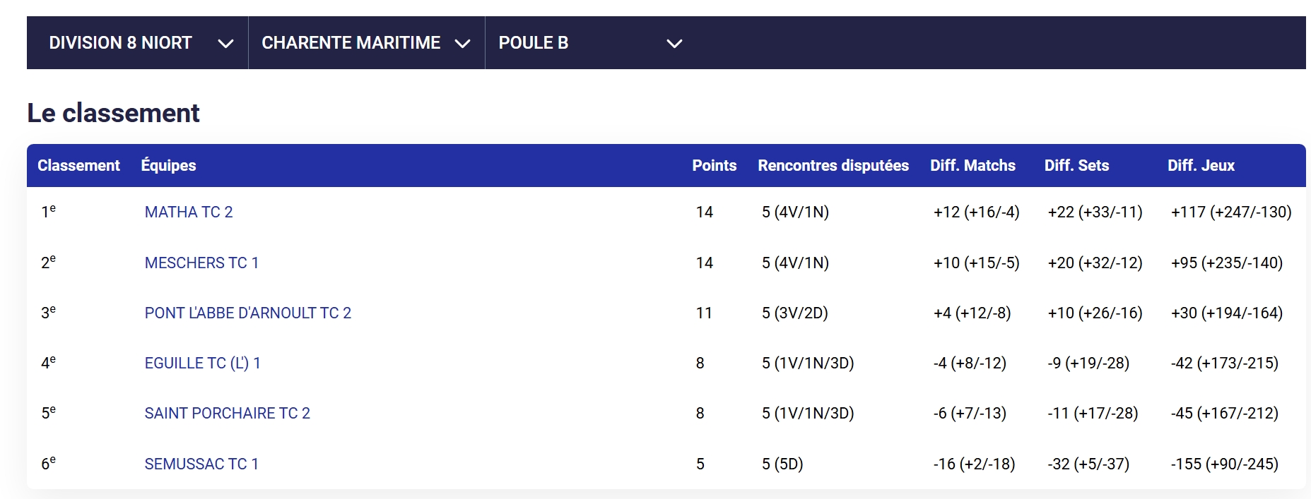 à domicile contre Pont l’abbé (3ème) la victoire est obligatoire pour finir 1er. Un 4/0 assure la 1ère place, et un 3/1 peut permettre à Meschers de nous dépasser au nombre de sets en cas de victoire 4/0 de leur part.